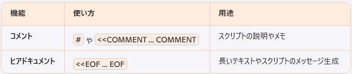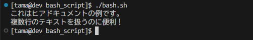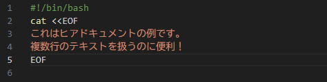 ヒアドキュメントは、複数行のテキストを処理する際に便利な方法です。特にスクリプト内で長いメッセージを出力するときや、一時的なファイルにデータを書き込むときに使います。