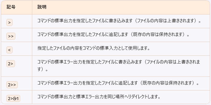 ちょっと分かりずらいのが 2>&1 ですが、標準出力と標準エラーをリダイレクトします