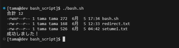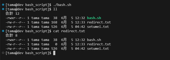 実行して、確認してみます。実態のファイル ./bash.shを実行。llコマンドでファイルをリストするとredirect.txtが