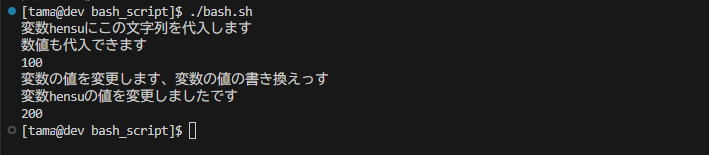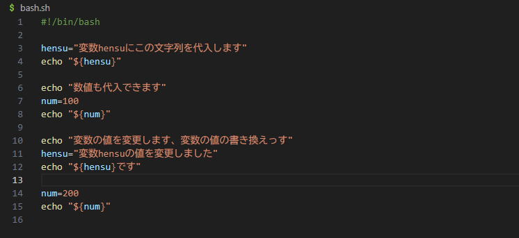 変数の値を使用するには、変数名の前に $ を付けます。 echo $hensu めんどくさくなければ${ }を使った方が