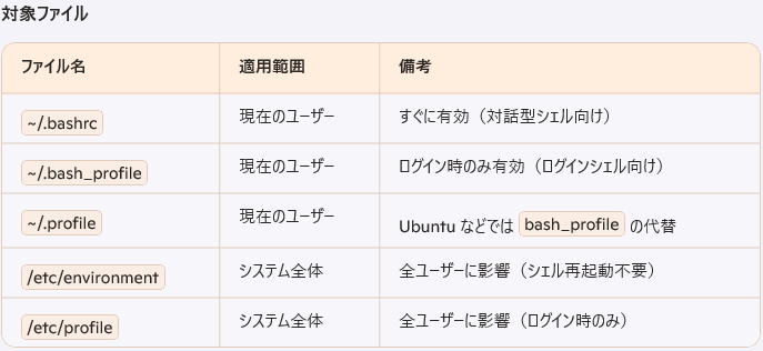 そのセッション(シェル)内でのみ有効です。したがって、そのシェルを閉じたりログアウトすると、設定された環境変数も失われます。