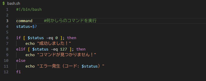 まだ、if文とか説明してないけど、こんなように使います。$?は直前のコマンドが正常終了したかのステータスが