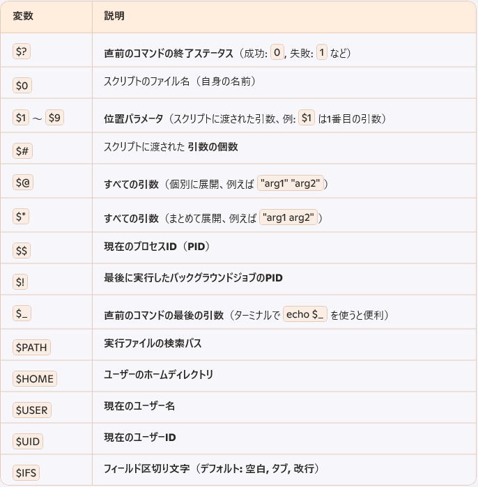一応、覚えて置いた方が良い特殊変数、環境変数の代表的なのをリストします。