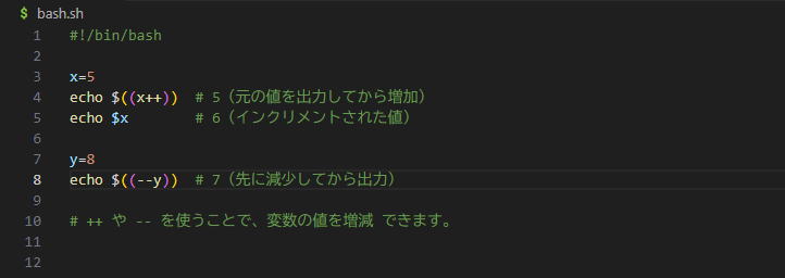 インクリメント ++ とデクリメント -- は、Bash などのプログラミング言語で 変数の値を 1 ずつ増減 させる演算子となります。